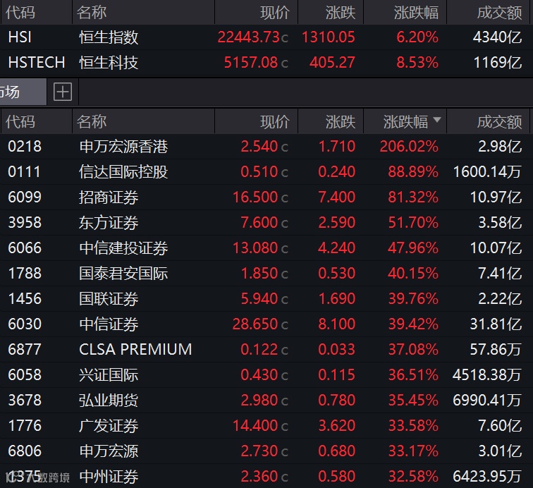 截至当天收盘时,申万宏源香港涨206%,信达国际控股涨超88%,招商证券涨超81%,东方证券涨超51%,中信建投证券、国泰君安国际涨超40%,中信证券、国联证券涨幅超过39%,兴证国际、广发证券、申万宏源、中金公司等涨幅均超过30%,光大证券、中国银河涨幅超过20%。