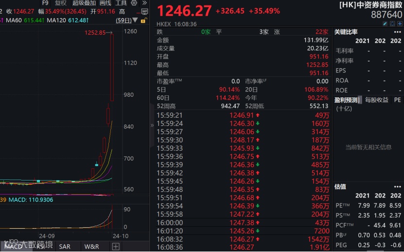 10月2日,港股市场继续大涨,在南向资金缺席情况下,港股大市成交仍超4300亿港元,居历史第三高。当日,券商股成为港股市场上“最靓的仔”,Wind中资券商指数全天暴涨35%,再创历史新高,近6个交易日,该指数的涨幅超过100%。