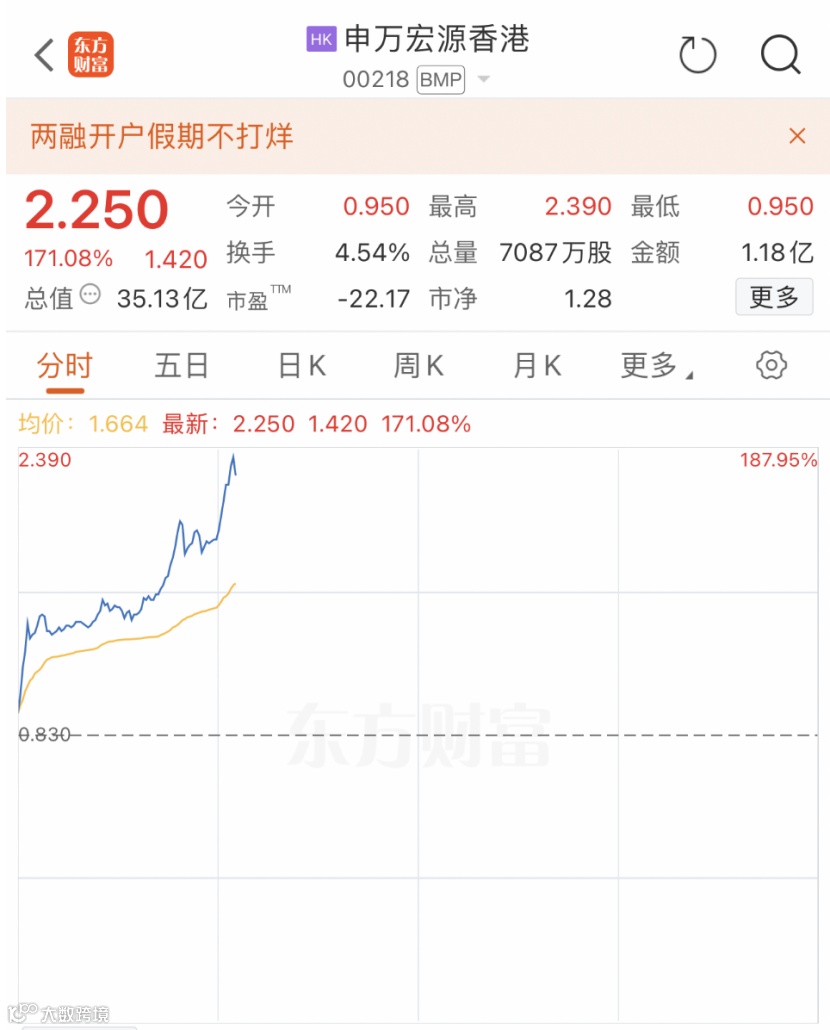 个股方面,申万宏源香港盘中最高暴涨188%,国泰君安国际大涨超40%,中信证券大涨超30%,兴证国际大涨超28%,东方证券大涨超24%,光大证券涨超23%,中国银河涨超19%,中金公司涨超18%。