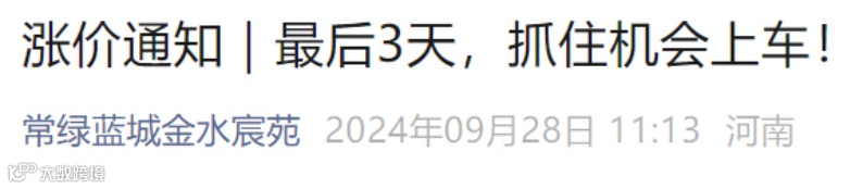 9月28日,据大河财立方报道,河南卓凯置业发文称,自9月30日24时起,对旗下常绿·金水宸苑项目(郑州)在售房源售价上调2%(约300元/平方米)。