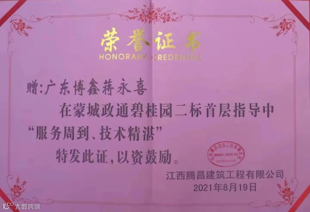 2021年8月19日,博鑫公司华南区域项目工程师蒋永喜荣获客户方江西腾昌建筑工程有限公司颁布的个人荣誉证书。在服务亳州蒙城政通碧桂园二标项目中,客户方对我司项目工程师蒋永喜认真负责、服务周到的工作态度及精湛技术给予高度肯定和诚挚感谢。