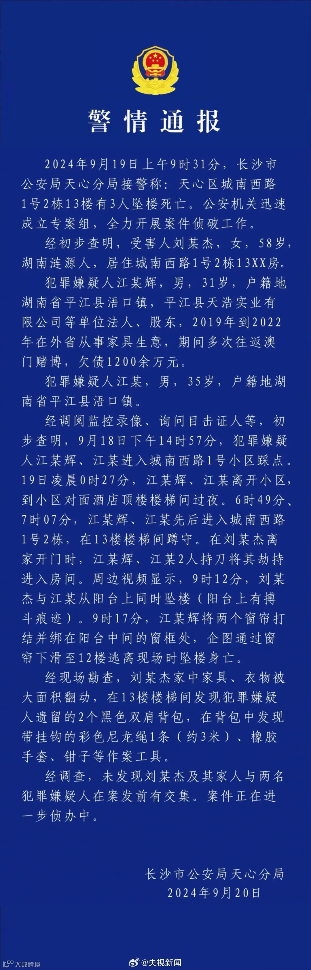 9月19日上午9时31分,湖南长沙市公安局天心分局接警称:天心区城南西路1号2栋13楼有3人坠楼死亡。公安机关迅速成立专案组,全力开展案件侦破工作。