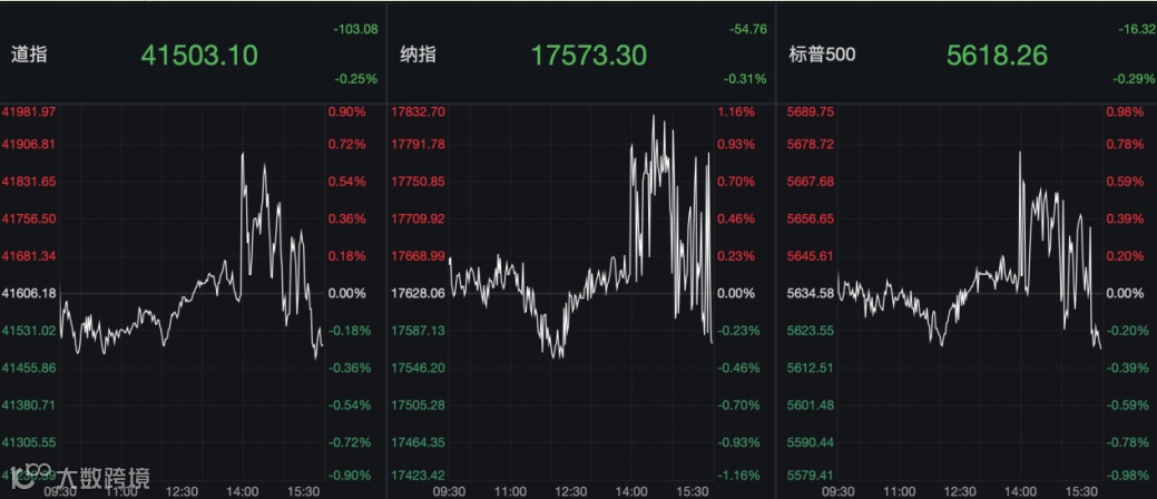 具体来看,美股三大指数涨幅迅速扩大,道指、标普500指数均在盘中创下历史新高,但随后三大指数很快回吐部分涨幅,三大指数全线转跌,道指跌0.25%,纳指跌0.31%,标普500指数跌0.29%。