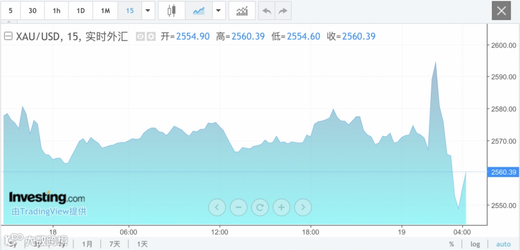 利率决议公布后,现货黄金迅速拉升,一度涨破2590美元/盎司,刷新最高纪录,随后亦大幅跳水,由涨转跌,截至凌晨4点左右,日内跌0.38%,报2559.76美元/盎司。
