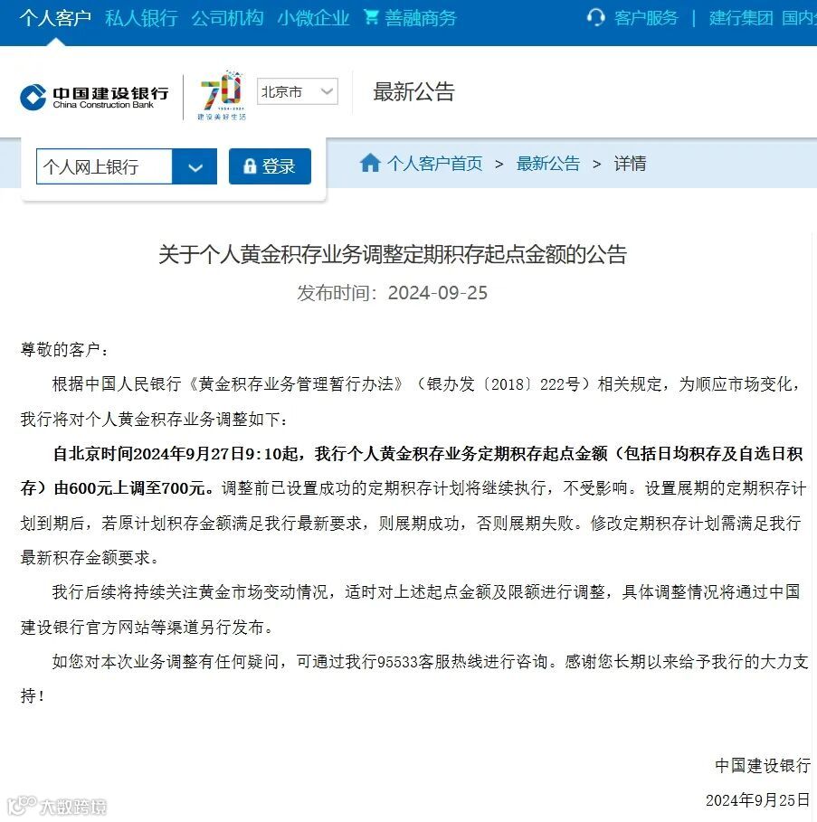 中国建设银行25日发布公告称,自北京时间2024年9月27日9:10起,个人黄金积存业务定期积存起点金额(包括日均积存及自选日积存)由600元上调至700元。调整前已设置成功的定期积存计划将继续执行,不受影响。设置展期的定期积存计划到期后,若原计划积存金额满足建行最新要求,则展期成功,否则展期失败。修改定期积存计划需满足建行最新积存金额要求。