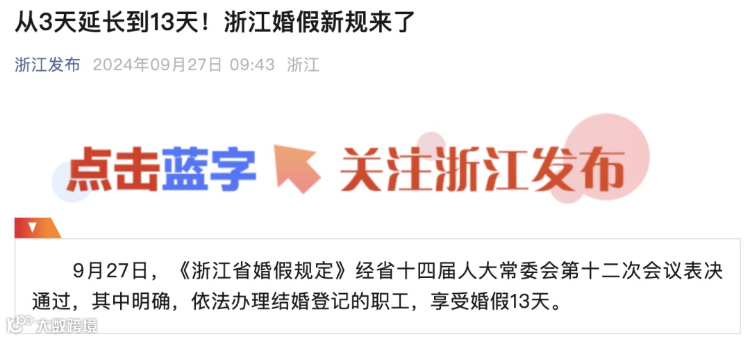 据浙江发布,9月27日,《浙江省婚假规定》经省十四届人大常委会第十二次会议表决通过,其中明确,依法办理结婚登记的职工,享受婚假13天。