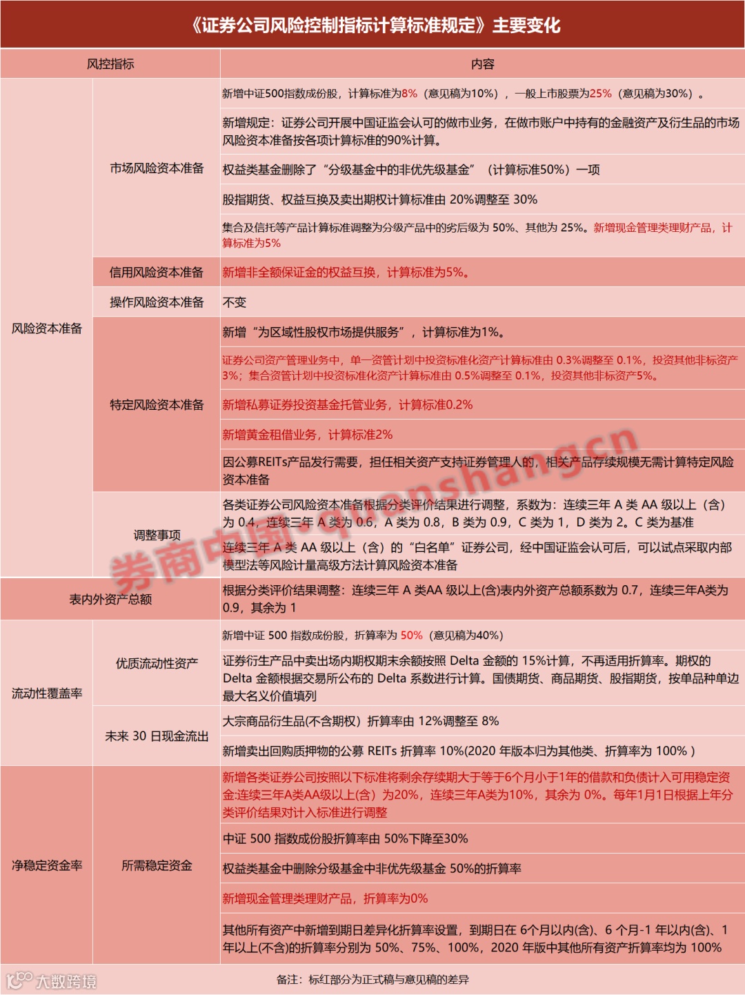 与意见稿不同的内容,包括:风险资本准备方面,新增中证500指数成份股,但计算标准从10%改为8%,一般上市股票从30%改为25%;新增现金管理类理财产品,计算标准为5%;新增非全额保证金的权益互换,计算标准为5%;新增私募证券投资基金托管业务,计算标准为0.2%;新增黄金租借业务,计算标准为2%。净稳定资金率方面,新增剩余存续期大于等于6个月小于1年的借款和负债计入稳定资金的标准,新增现金管理类理财产品,折算率为0%。