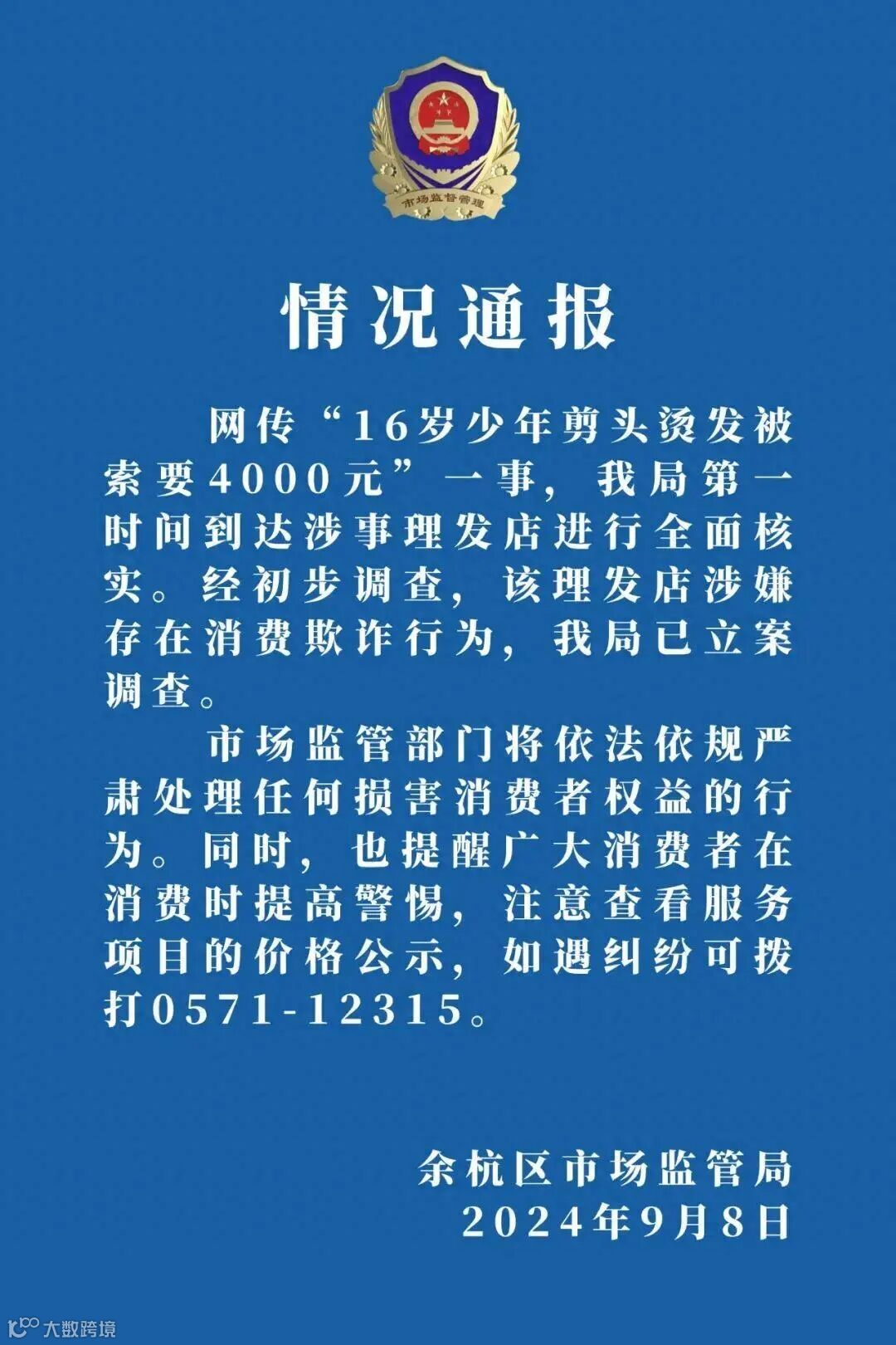 9月8日晚,余杭区市场监管局发布情况通报:网传“16岁少年剪头烫发被索要4000元”一事,我局第一时间到达涉事理发店进行全面核实。经初步调查,该理发店涉嫌存在消费欺诈行为,我局已立案调查。市场监管部门将依法依规严肃处理任何损害消费者权益的行为。