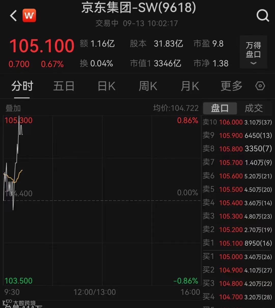 今日,京东港股股价高开,盘中大涨近1%,截至发稿涨0.67%,报105.10港元/股。