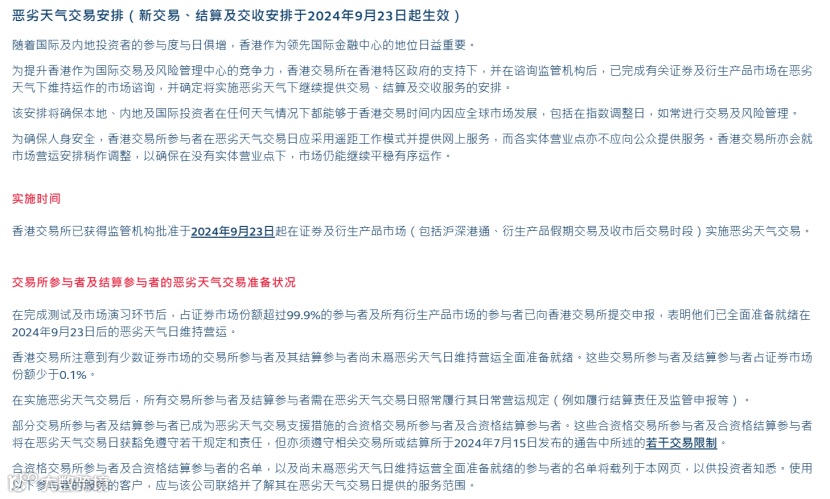 9月16日,港交所宣布,交易所已获监管机构批准实施恶劣天气交易。恶劣天气交易将由2024年9月23日起生效。于交易所或透过交易所(包括沪深港通的北向及南向交易)进行的证券交易将在恶劣天气情况下继续维持交易。与常规交易日的情况相若,所有交易所参与者需要于恶劣天气下继续提供交易相关的服务。