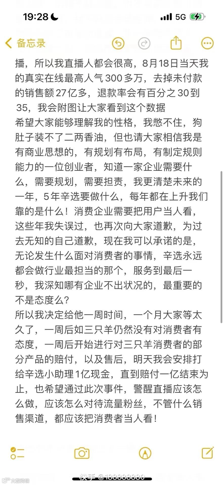 同时辛巴表示:“决定给三只羊一周时间,一周后如三只羊仍然没有对消费者有态度,将开始进行对三只羊消费者的部分产品的赔付,以及售后,明天我会安排打给辛选小助理1亿元现金,直到赔付1亿元结束为止。”