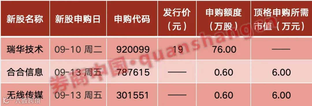 本周(9月9日——9月13日)3只新股申购。周二:瑞华技术;周五:合合信息、无线传媒。
