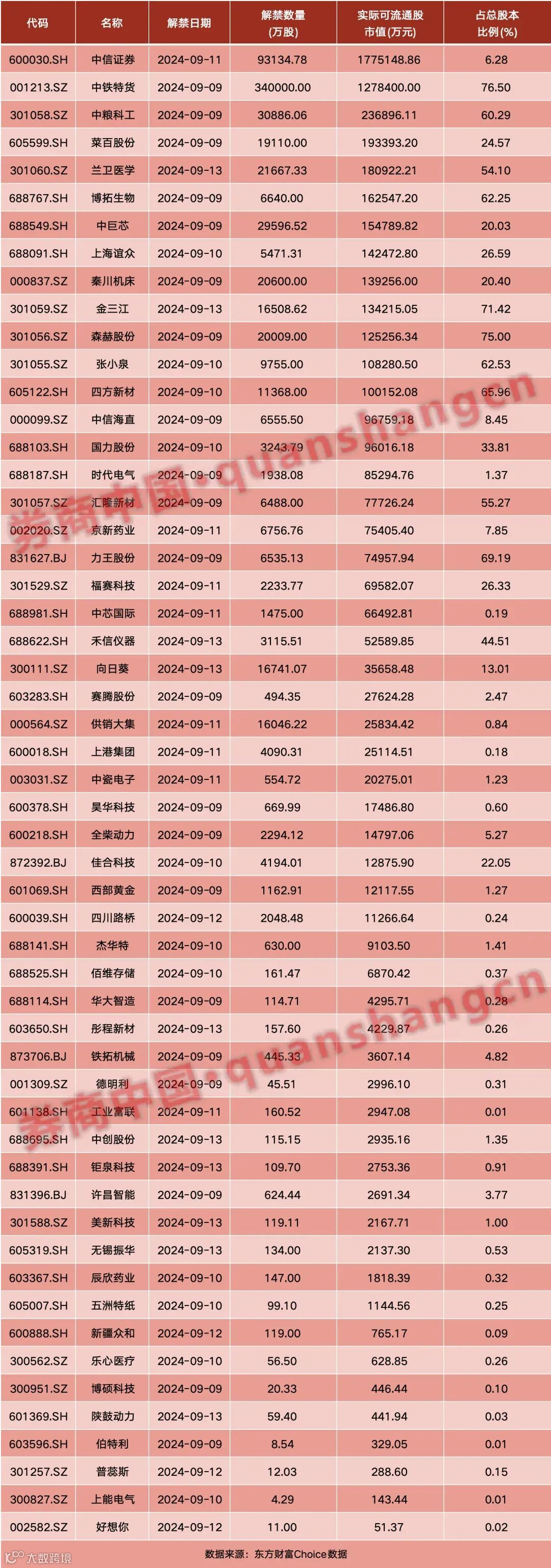 数据显示,本周(9月9日——9月13日)共有54家公司限售股陆续解禁,合计解禁量71.47亿股,按9月6日收盘价计算,解禁市值为568.24亿元。