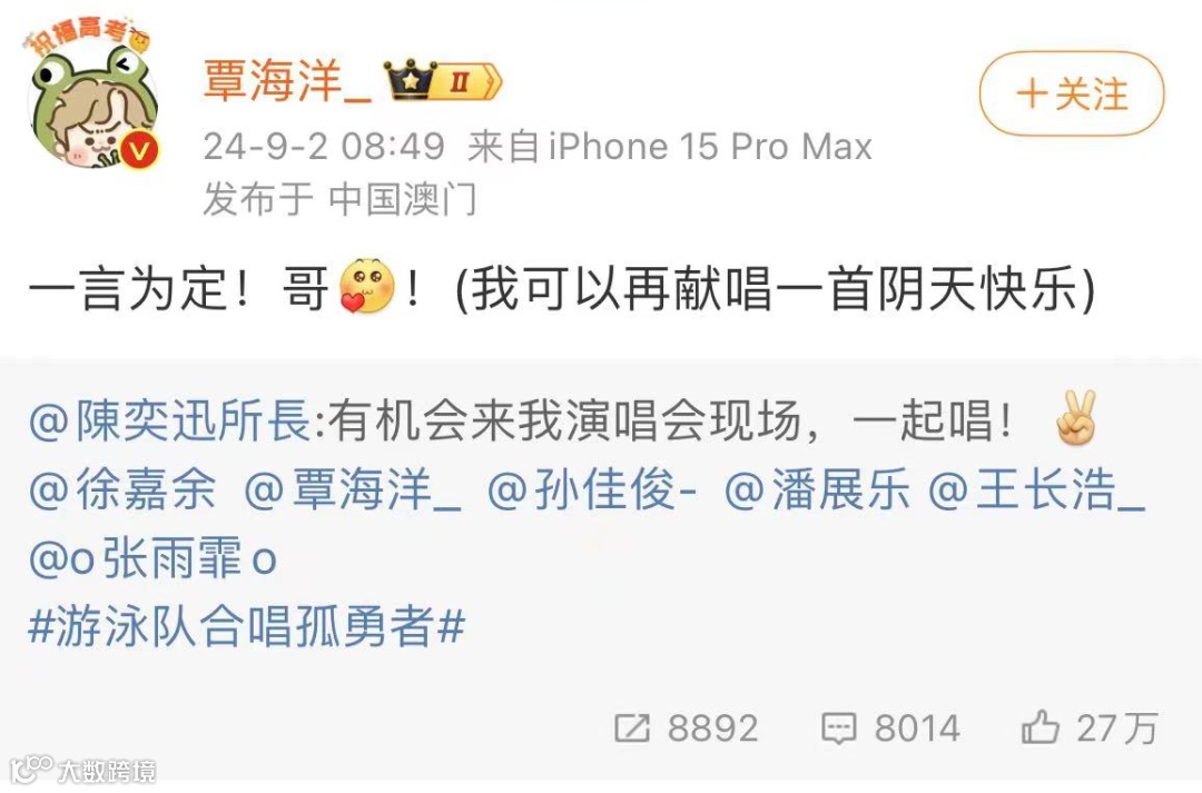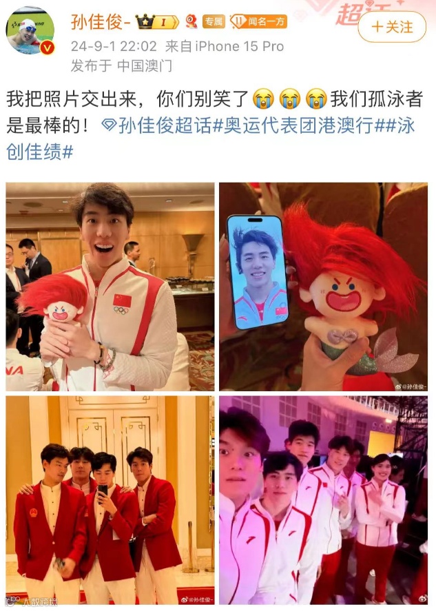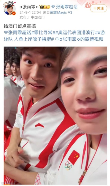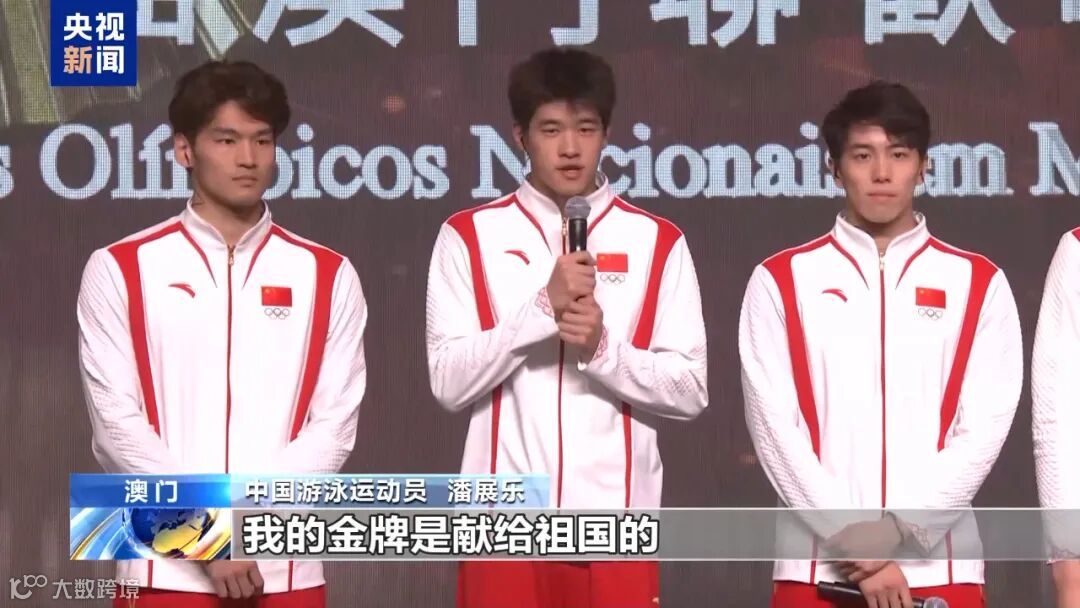 中国游泳队运动员和澳门歌手一起合唱《孤勇者》。
