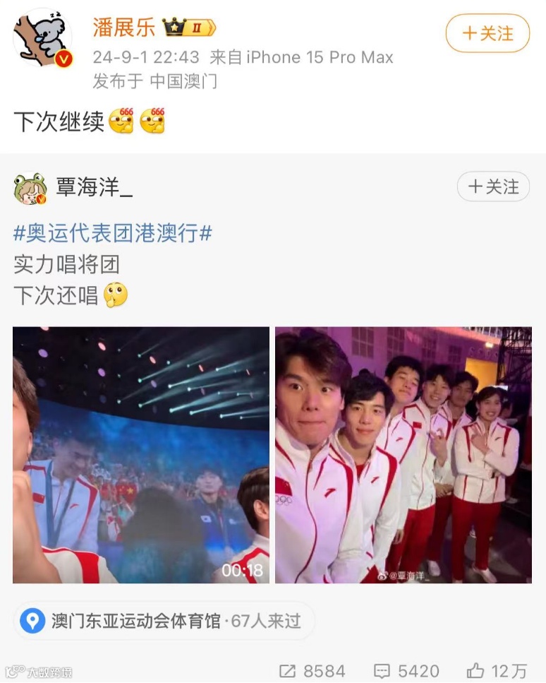 表演结束后,运动员表示:“实力唱将团,下次还唱”,“对不起,下次还敢”,“给澳门留点震撼”。