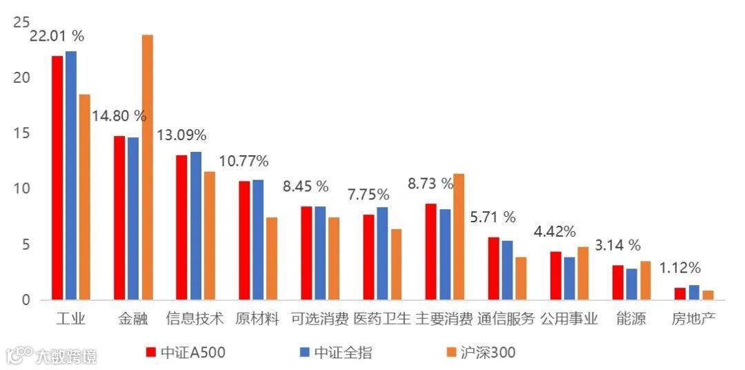 此外,指数编制结合互联互通、ESG等筛选条件,便利境内外中长期资金配置A股资产。长期来看,上市公司行业市值结构与国家产业结构长期变化趋势趋于一致,这一切使中证A500指数具有明显的新质生产力特质,指数样本行业分布体现新质生产力特征,先进制造、信息技术行业权重相比沪深300指数提升,金融、主要消费行业权重占比显著降低,体现新质生产力特征。