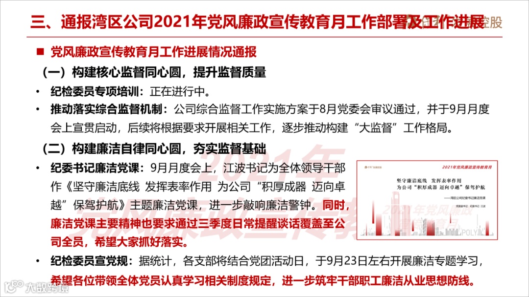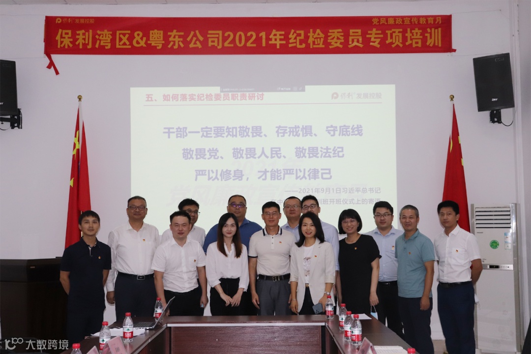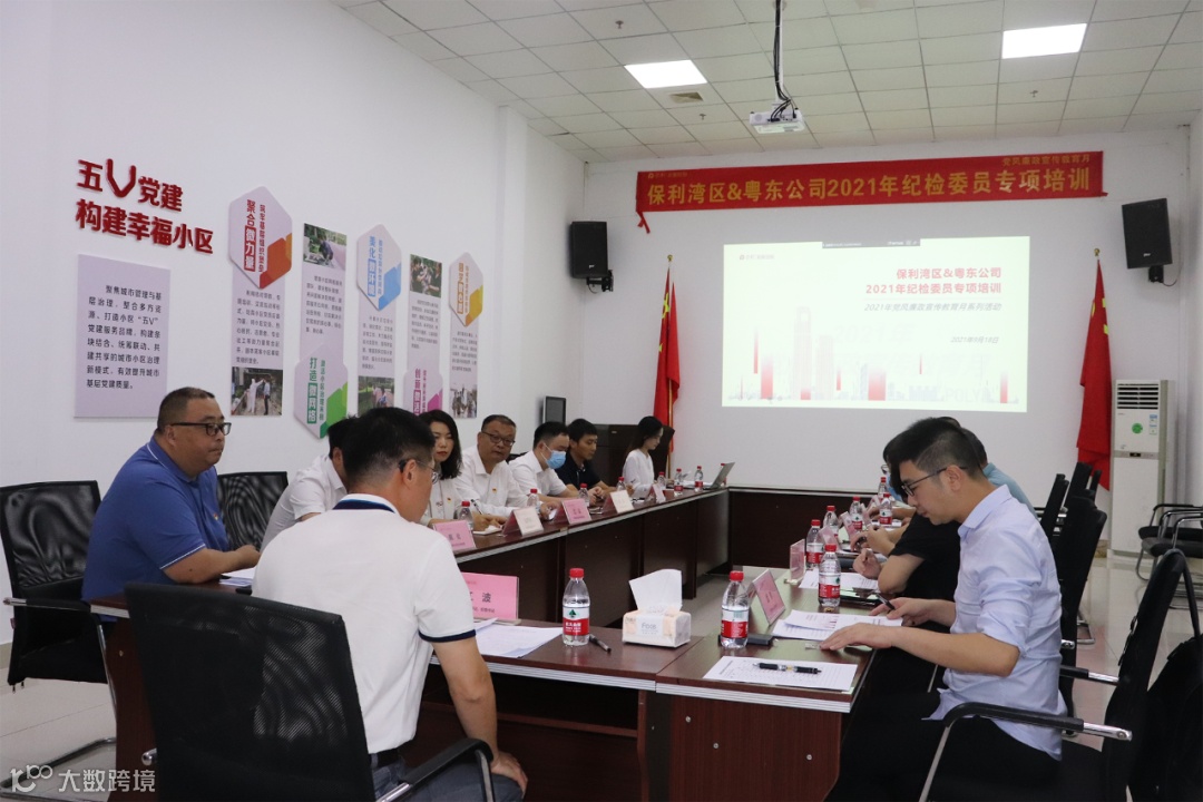 2021年9月18日,根据党风廉政宣传教育月工作部署,为进一步强化纪检工作队伍业务水平和履职能力,提升支部抓好党风廉政建设工作能力,保利湾区公司、粤东公司联合举行2021年纪检委员专项培训,湾区&粤东公司党委副书记、纪委书记江波,纪委委员、各党支部纪检委员以及不设支委的支部书记和代表同志,共计14人参加培训。