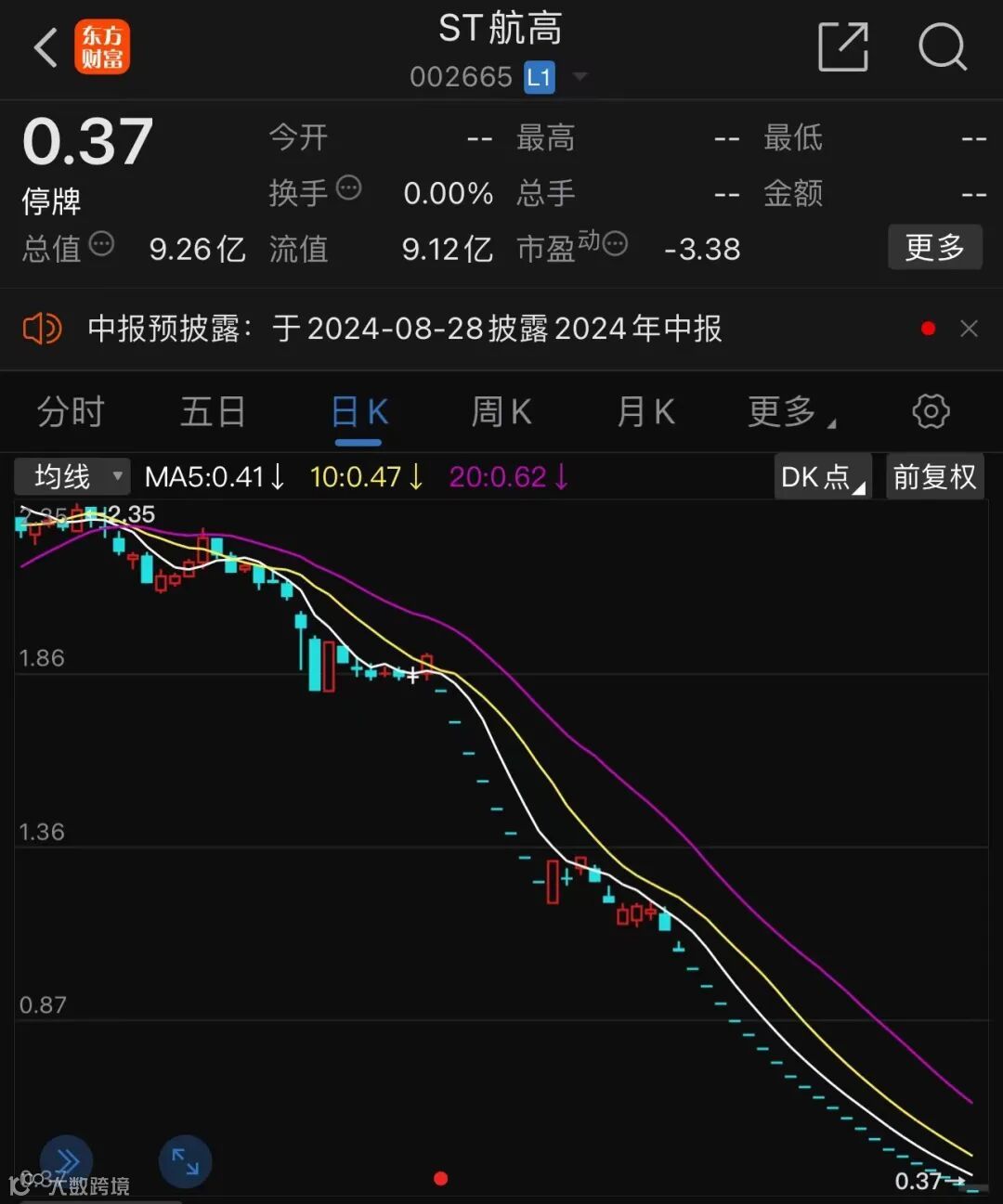 8月26日被摘牌后,ST航高股票将转入退市板块挂牌转让。