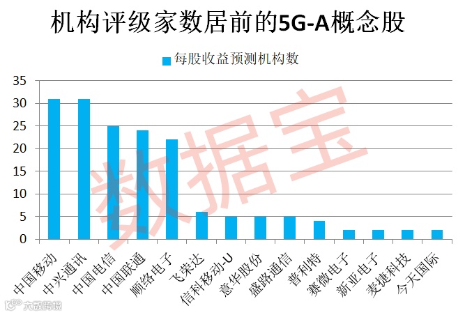 布局5G-A行业的概念股当中,多只股票获机构关注度高。据数据宝统计,获得机构“积极型”评级(含买入、增持、强烈推荐等)的概念股有22只。中国移动、中兴通讯、中国电信、中国联通、顺络电子获得20家以上机构评级。