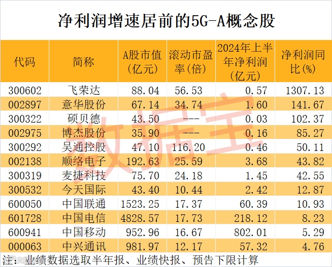 据证券时报·数据宝统计,截至目前,按照半年报、业绩快报、预告净利润下限(无下限则取公告数值)计算,上半年净利润同比增长(含扭亏为盈)的5G-A概念股有12只,其中飞荣达、意华股份、硕贝德、博杰股份、吴通控股净利润增速居前。