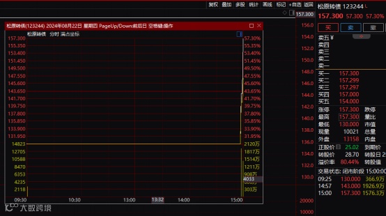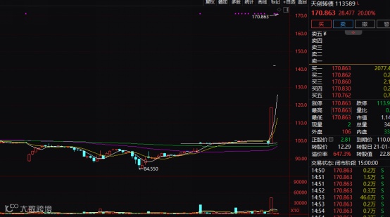 今天上午,深交所发布关于“松原转债”盘中临时停牌的公告称,“松原转债”(123244)盘中成交价较发行价首次上涨达到或超过30%,根据《深圳证券交易所可转换公司债券交易实施细则》等有关规定,深交所自今日09时30分00秒起对该债券实施临时停牌,于14时57分00秒复牌。天创转债则再度“20cm”涨停,这是该可转债连续第3个交易日“20cm”涨停。