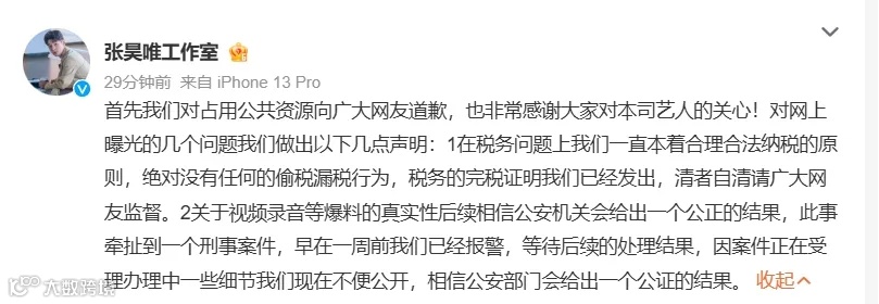 首先我们对占用公共资源向广大网友道歉,也非常感谢大家对本司艺人的关心!对网上曝光的几个问题我们做出以下几点声明:1在税务问题上我们一直本着合理合法纳税的原则,绝对没有任何的偷税漏税行为,税务的完税证明我们已经发出,清者自清请广大网友监督。2关于视频录音等爆料的真实性后续相信公安机关会给出一个公正的结果,此事牵扯到一个刑事案件,早在一周前我们已经报警,等待后续的处理结果,因案件正在受理办理中一些细节我们现在不便公开,相信公安部门会给出一个公证的结果。