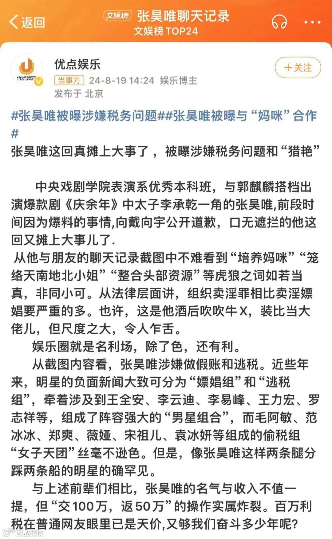 优点娱乐还放出了聊天记录中的张昊唯录音。