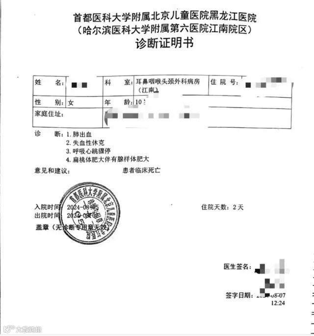 近日,有哈尔滨网友发视频称自己10岁女儿,在哈尔滨某医院做扁桃体微创手术,不幸死亡。