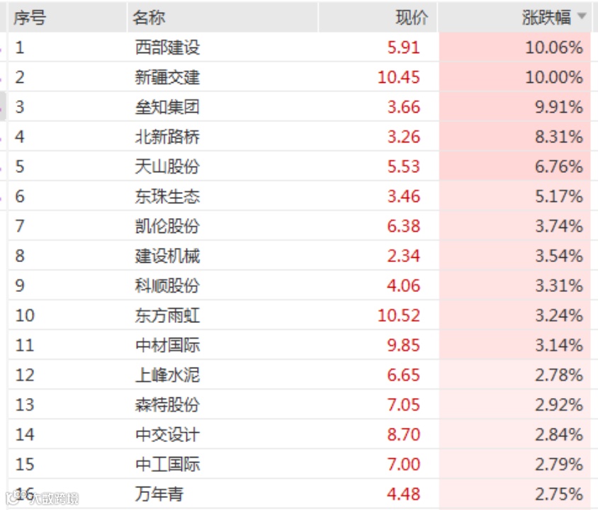 西部基建概念股表现不俗,西部建设、新疆交建涨停,北新路桥涨逾8%。