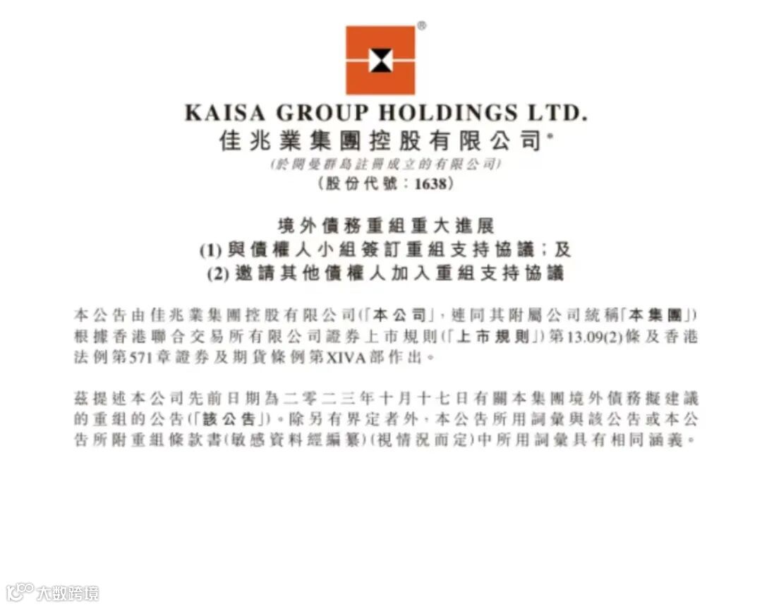 8月20日,佳兆业集团在港交所公告,与债权人小组订立重组支持协议,有关债权分别占佳兆业范围内债务未偿还本金总额的34%以上及瑞景范围内债务未偿还本金总额的36%以上。