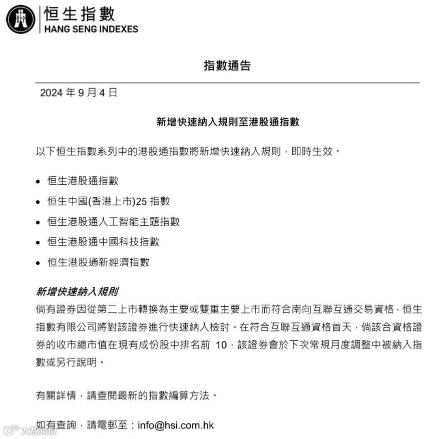 9月4日,恒生指数修改规则,新增港股通指数快速纳入规则,针对从第二上市转换为主要或双重主要上市而符合南向互联互通交易资格的证券,即时生效。