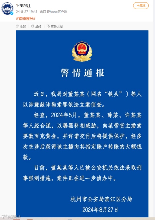 8月27日晚间,杭州警方发布通报称,“铁头”等人涉嫌敲诈勒索罪,已被公安机关依法采取刑事强制措施,案件正在进一步侦办中。