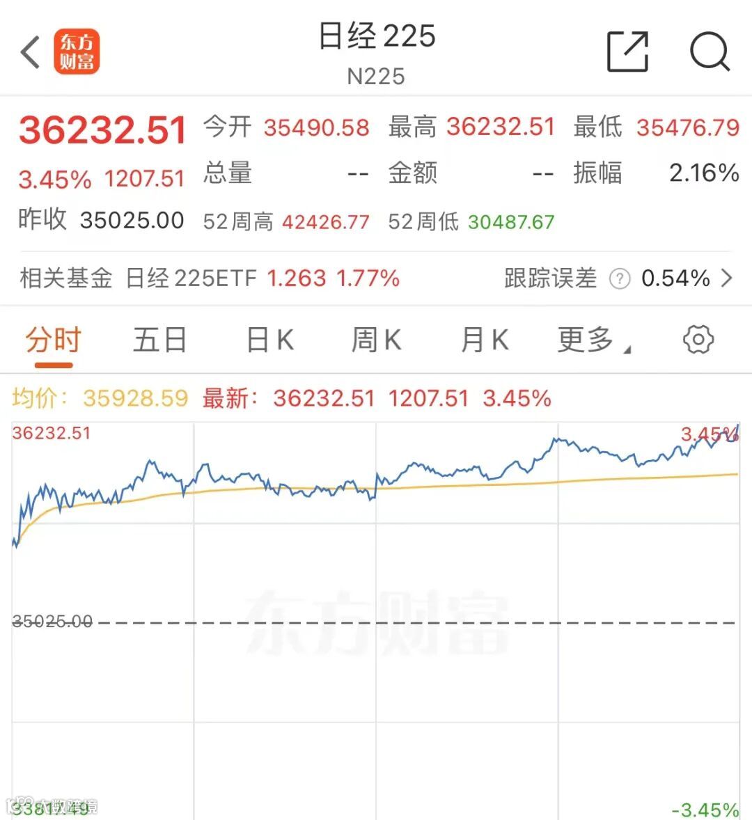 截至今日收盘,日经225指数涨3.45%,报36232.51点。