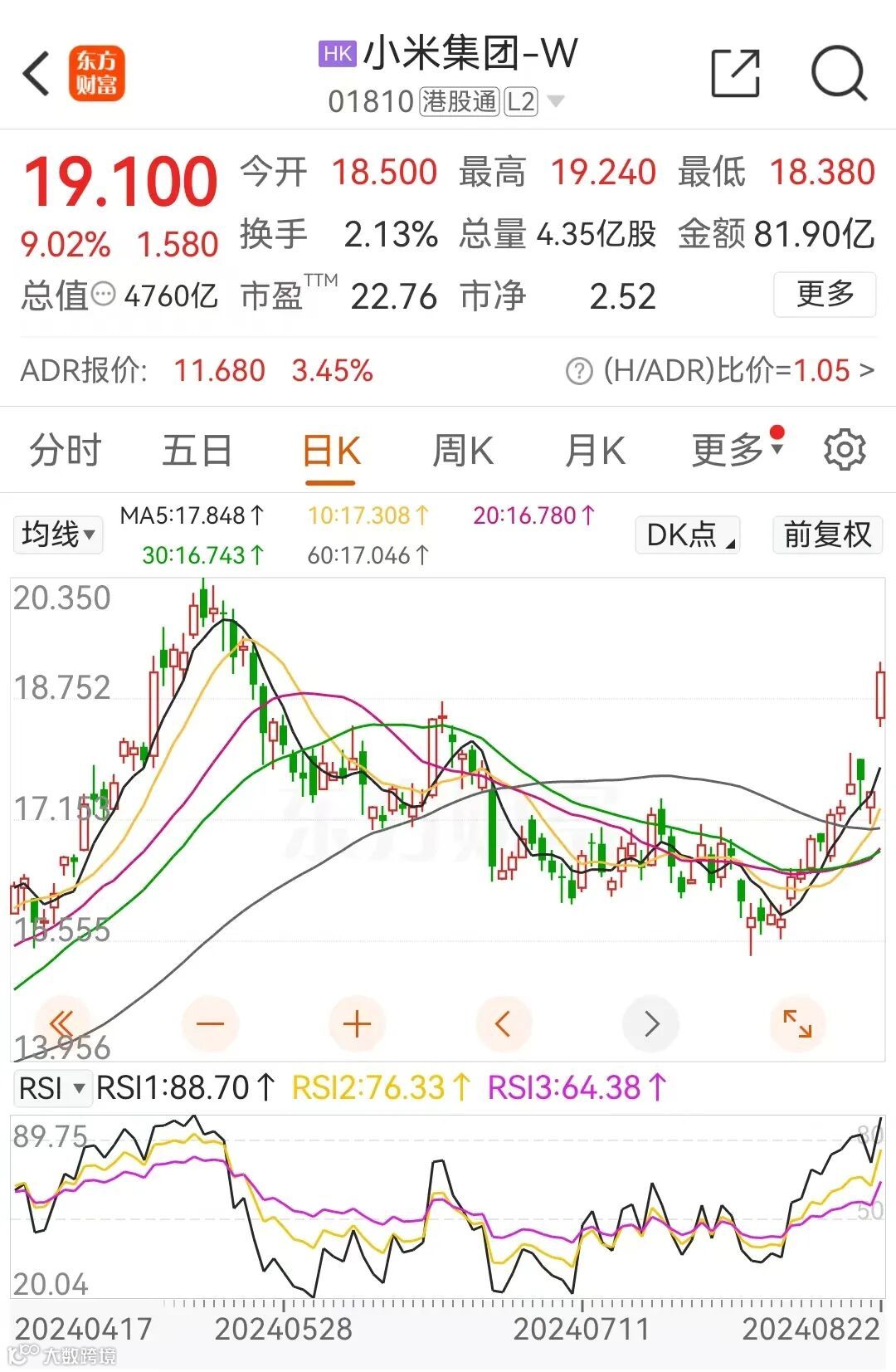 虽然卖车亏损,但市场普遍认为小米的营收高于预期。受此提振,8月22日,小米集团股价大涨超9%,收盘报19.10港元,最新总市值为4760亿港元。