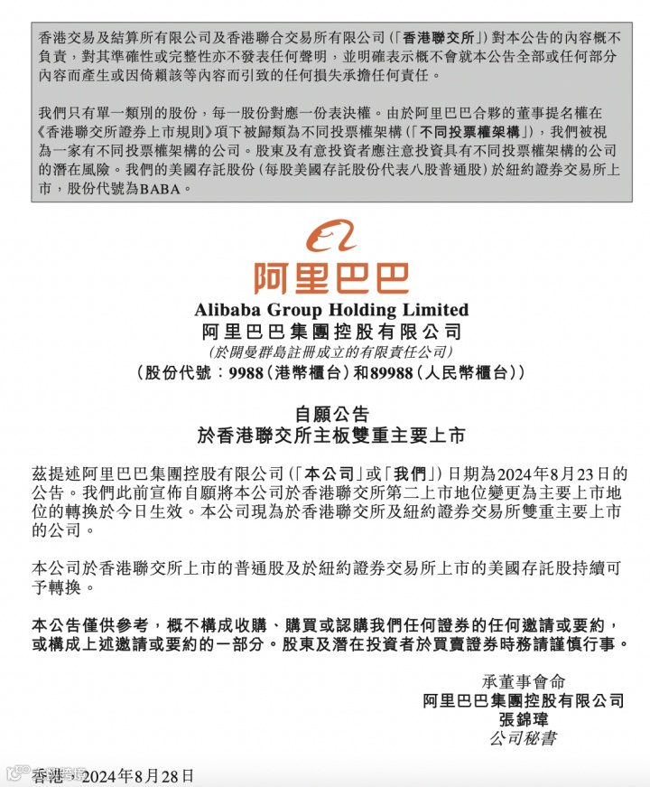 8月28日,阿里巴巴集团发布公告,正式完成香港双重主要上市,成为在港交所和纽交所双重主要上市的公司,公司发展迎来新的里程碑时刻。