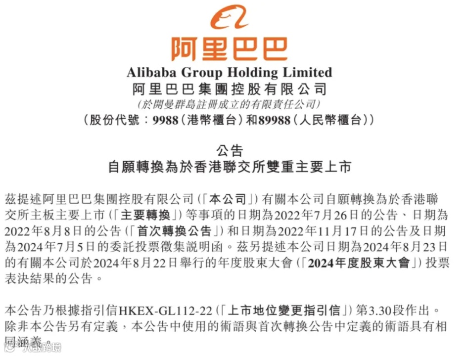 阿里巴巴曾在今年5月份发布2024财年年报时透露,预计于2024年8月底完成香港主要上市转换。完成转换后,阿里巴巴将在香港联交所主板及纽约证券交易所两地双重主要上市。