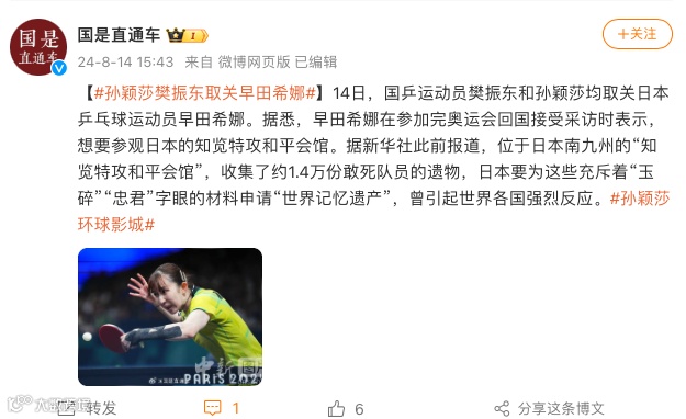 14日,国乒运动员樊振东和孙颖莎均取关日本乒乓球运动员早田希娜。据悉,早田希娜在参加完奥运会回国接受采访时表示,想要参观日本的知览特攻和平会馆。