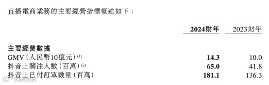 2024财年,东方甄选包括抖音、淘宝和自有APP等所有渠道的已付商品交易总额(GMV)达到143亿元,同比增加43%,其中来自抖音的GMV占大部分。2024财年,抖音上第三方产品及自营产品的已付订单总数由2023财年的1.36亿单增至1.81亿单。
