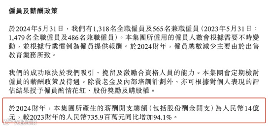 东方甄选员工的待遇提升,在财报中也得到印证。财报显示,2024财年,在员工总数有所减少的情况下,东方甄选的薪酬开支总额(包括股份酬金开支)达14亿元,较2023财年的7.36亿元同比增加94.1%。