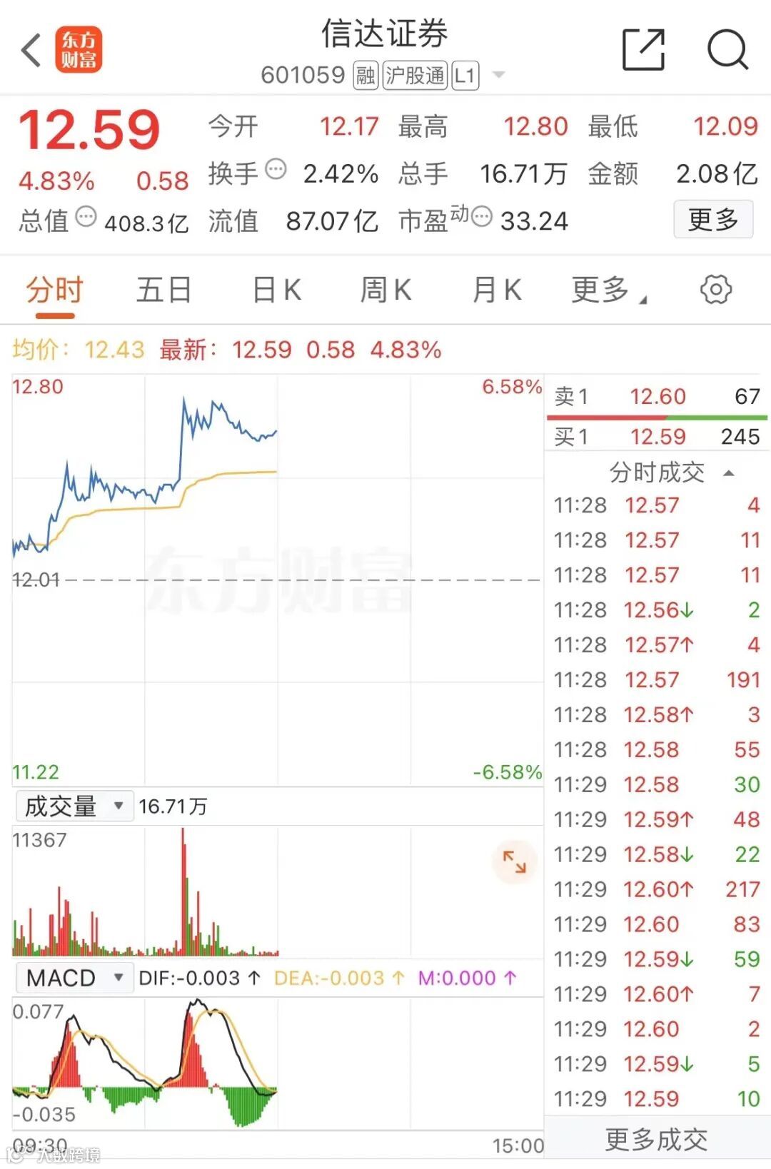 8月28日,信达证券股价一度涨超6%,截至午盘,涨4.83%,报12.59元/股。