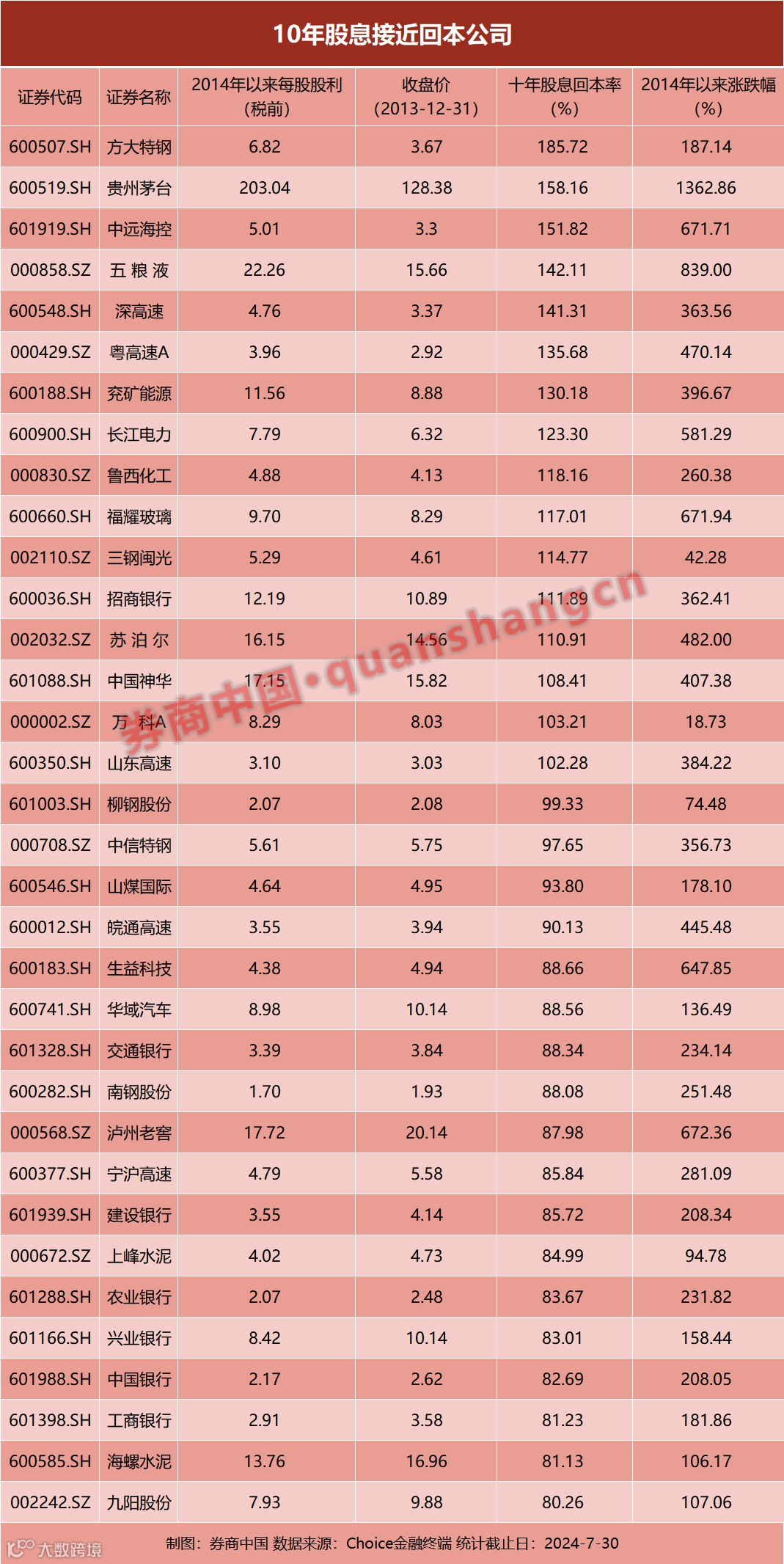福耀玻璃2014年以来的每股累计股息为9.7元,为其10年前股价的117%;长江电力2014年以来的每股累计股息为7.7926元,为其10年前股价的123%。