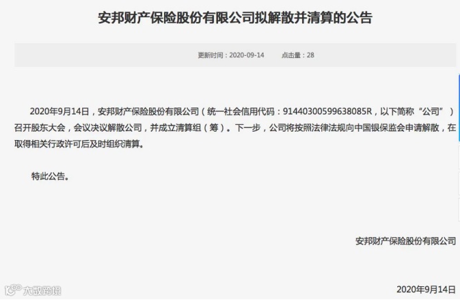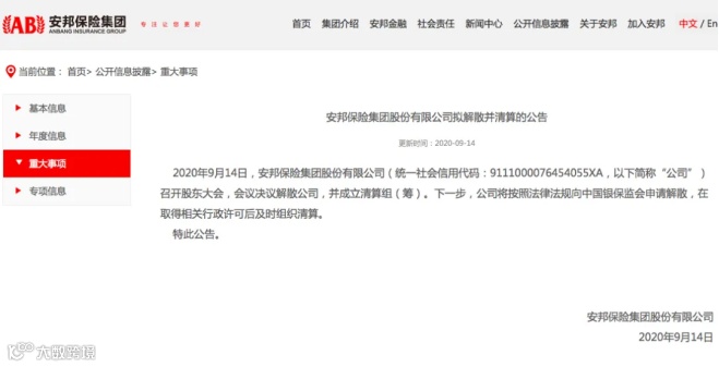 2020年9月14日,安邦集团及安邦财险分别在公司官网发布拟解散并清算的公告。公告称,安邦集团和安邦财险已召开股东大会决议解散公司,成立清算组(筹),将向(原)银保监会申请解散,在取得相关行政许可后及时组织清算。