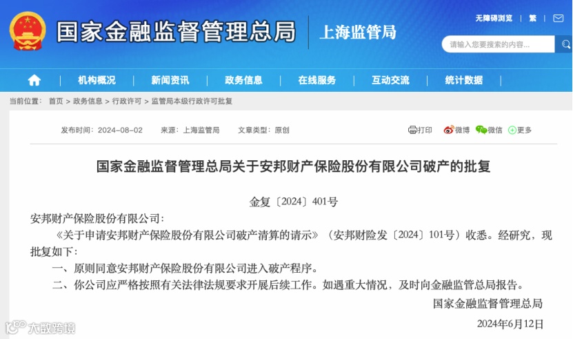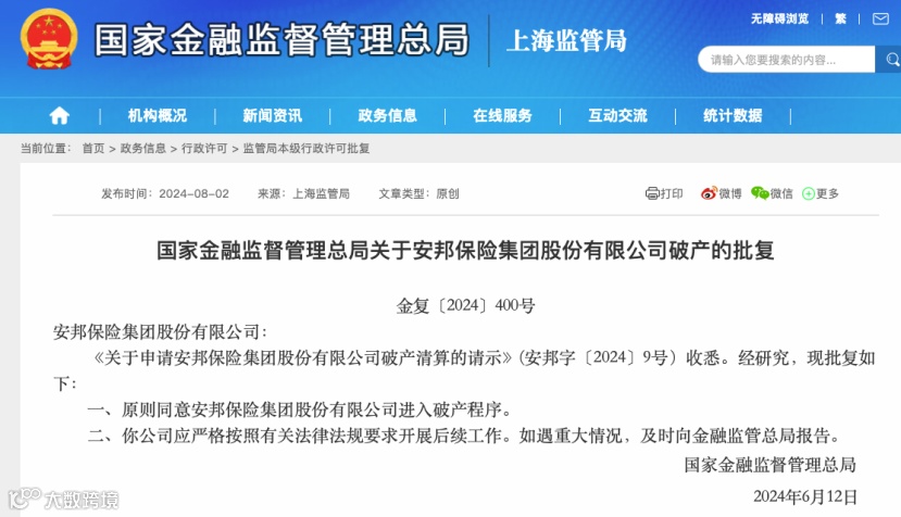 8月2日,金融监管总局官网公布两份批文显示,原则同意安邦保险集团股份有限公司进入破产程序,原则同意安邦财产保险股份有限公司进入破产程序,两份批文的落款日期为2024年6月12日。