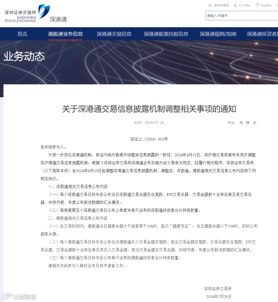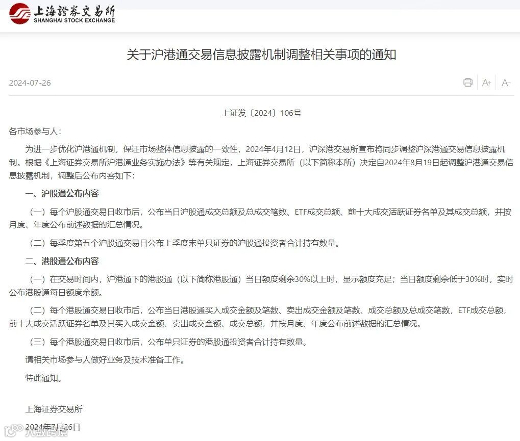7月26日,沪深交所发布通知称,决定自2024年8月19日起调整沪、深港通交易信息披露机制。