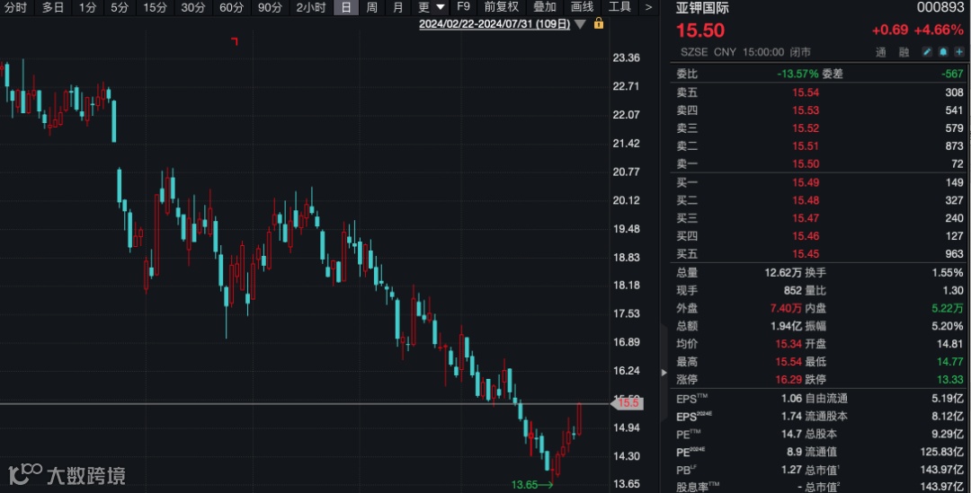 经过阶段性股价下行,截至7月31日收盘,亚钾国际报15.5元/股。但此番交易双方同意标的股份的转让价格为17.53元/股。