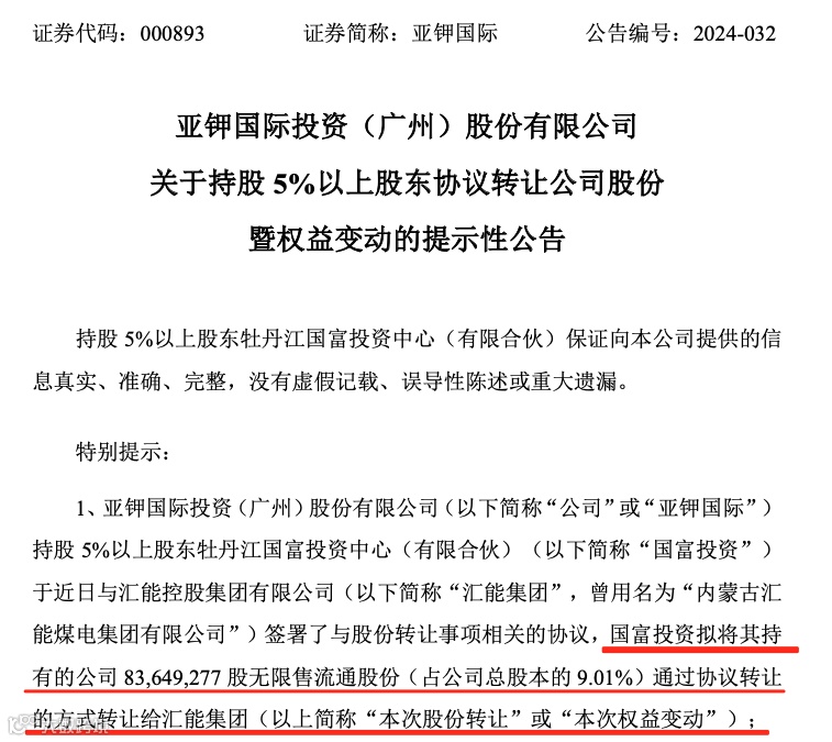 7月31日晚间亚钾国际公告,持股5%以上股东牡丹江国富投资中心(有限合伙)(下称“国富投资”)于近日与汇能控股集团有限公司(下称“汇能集团”,曾用名为“内蒙古汇能煤电集团有限公司”)签署了与股份转让事项相关的协议。国富投资拟将其持有的亚钾国际8364.93万股无限售流通股份(占上市公司总股本的9.01%)通过协议转让的方式转让给汇能集团。