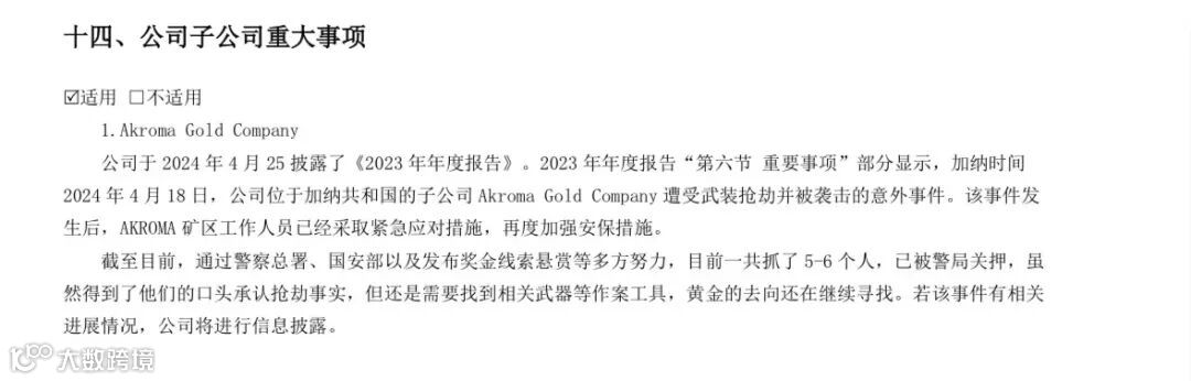 晓程科技介绍,加纳时间 2024年4月18日,清晨5点20分左右,公司位于加纳共和国的子公司Akroma Gold Company 遭受武装抢劫并被袭击的意外事件。