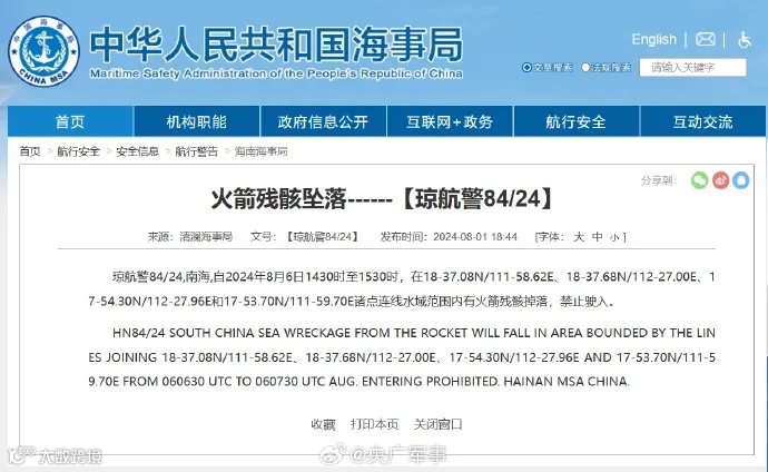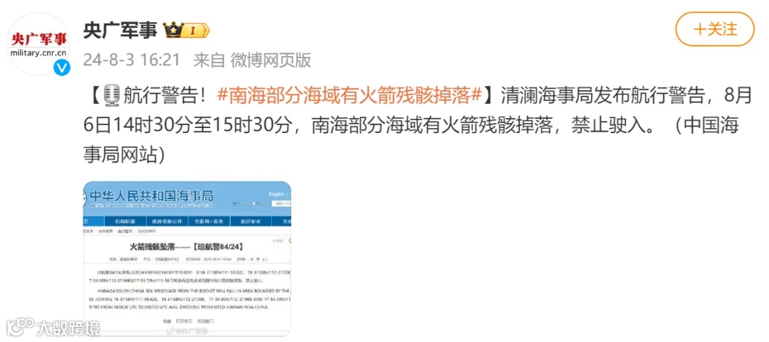清澜海事局发布航行警告,8月6日14时30分至15时30分,南海部分海域有火箭残骸掉落,禁止驶入。
