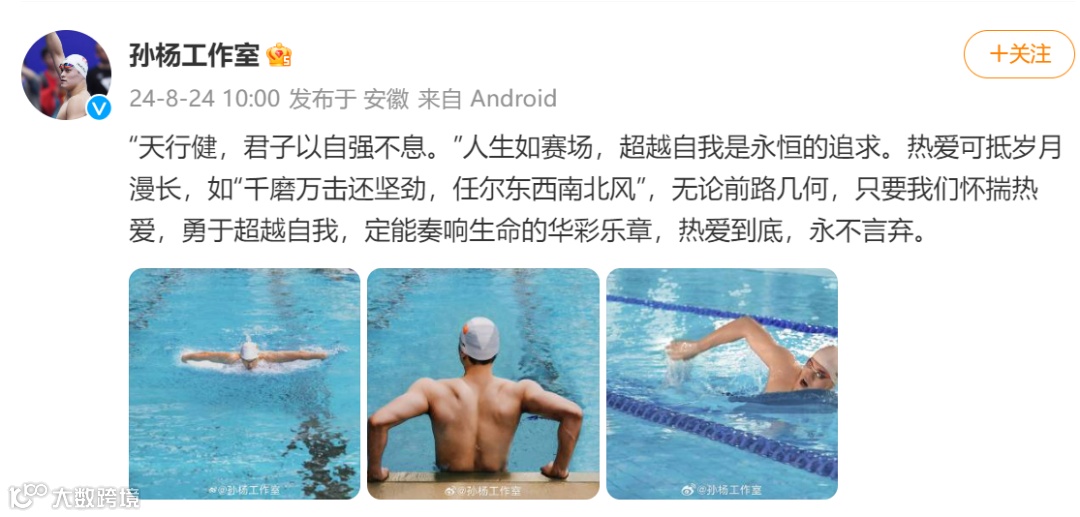 赛前,8月24日,@孙杨工作室 发文:“‘天行健,君子以自强不息。’人生如赛场,超越自我是永恒的追求。热爱可抵岁月漫长,如'千磨万击还坚劲,任尔东西南北风',无论前路几何,只要我们怀揣热爱,勇于超越自我,定能奏响生命的华彩乐章,热爱到底,永不言弃。”