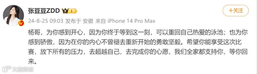 孙杨妻子@张豆豆ZDD 发文写道:杨哥,为你感到开心,因为你终于等到这一刻,可以重回自己热爱的泳池;也为你感到骄傲,因为在你的内心不曾褪去重新开始的勇敢坚毅。